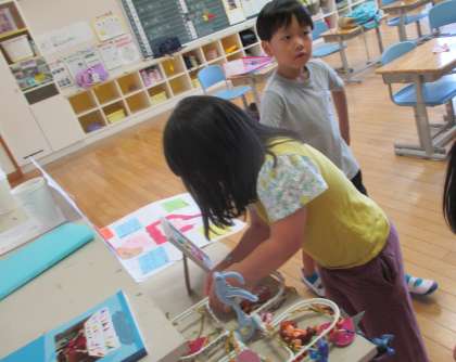 2年生は、始業式後の教室で、がんばってまとめてきた自由研究をうれしそうに見せ合ったり、実際に手にとって使ってみたりしていました。また、作品応募の作品を多教科室に張り切って提出してきた姿には、小学生として2回目の夏休みを楽しんだ「余裕」が感じられました。