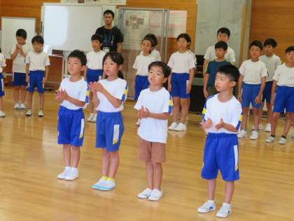 8月31日(木)1年生 (全校音楽) 公開日 2023/08/31 更新日 2023/08/31 1年生の部屋 1年生が中心となって歌う歌は、「むすんでひらいて」です。手遊びをしながら歌います。それを全校児童が、追いかけるように歌います。