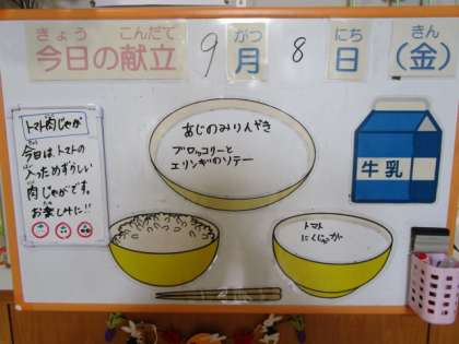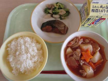 今日の献立は、ごはん、牛乳、鯵のみりん焼き、ブロッコリーとエリンギのソテー、トマト肉じゃがです