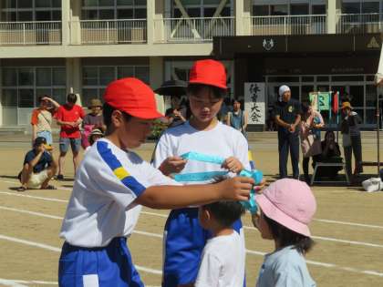 お世話をするのは4・5年生。優しく、頼もしく声をかけたり、ゴールでメダルをかけたりしました。