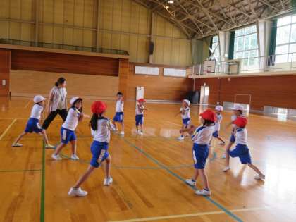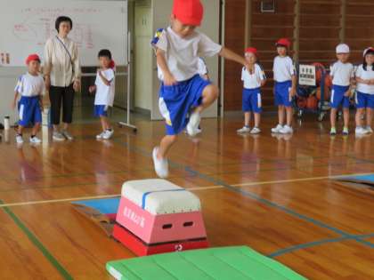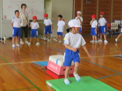 今日の体育から、「いくぞ!!にんじゃしゅぎょう〜とびばこのだん〜」が始まりました。跳び箱を使って、忍者の修行。「跳ぶ」だけではなく、またぎ超す、上るなどたくさんの技を習得していきます。