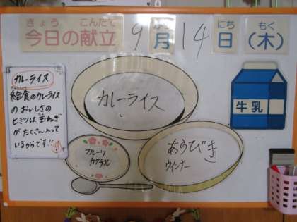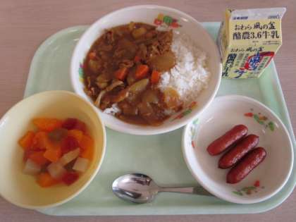 今日の献立は、カレーライス、あらびきウインナー、フルーツカクテルです。