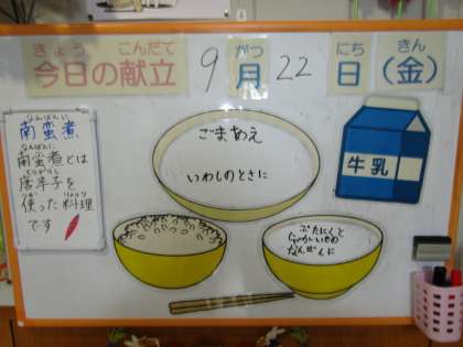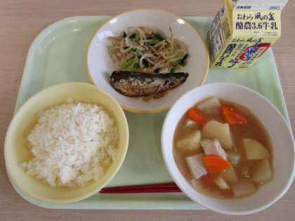 今日の献立は、ごはん、牛乳、いわしの土佐煮、ごまあえ、豚肉とじゃがいもの南蛮煮です。
