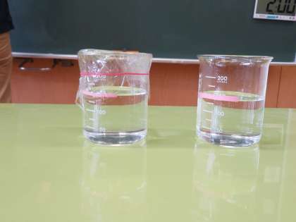 子供たちは、覆いをしたビーカーと覆いをしていないビーカーをよく観察して、疑問をもちました。二つのビーカーを見比べると、覆いをしていないビーカーの水の量が減っています。また、覆いをしたビーカーの方は、ビーカーやラップの内側に水滴がついていることが分かりました。