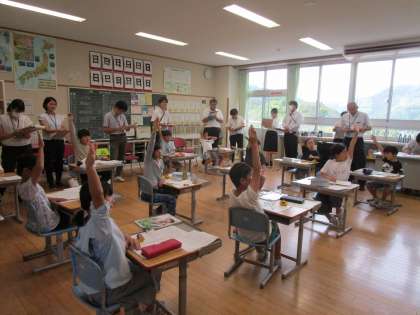 富山市のいろいろな学校から来られた先生方に見守られながら、電気の学習を張り切る3年生です。