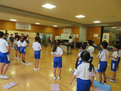 今日の全校音楽の声出しでは、木琴を3本のバチを使った5年生が伴奏し、2つのポイントをつかみました。