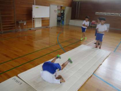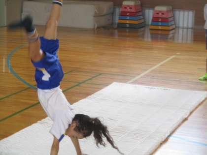 3・4年生の体育ではマット運動に取り組んでいます。自分たちで連続技を考え、きれいな技を披露するためにチームごとに練習しました。
