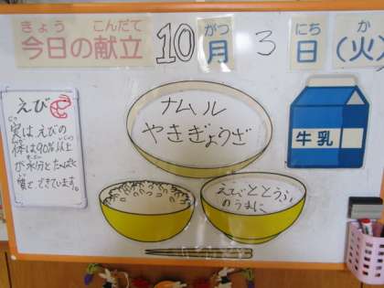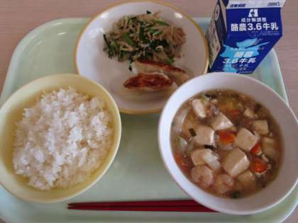 今日の献立は、ごはん、牛乳、焼きぎょうざ、ナムル、えびと豆腐のうま煮です。
