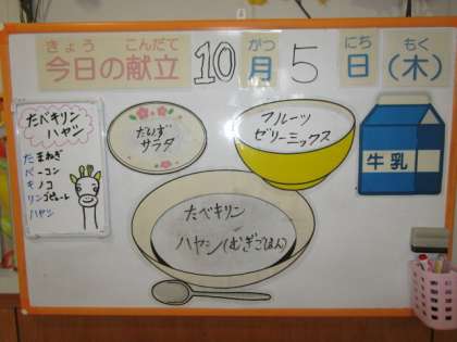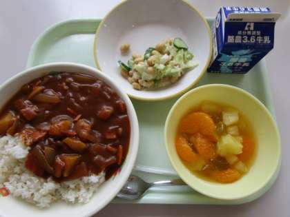今日の献立は、麦ごはん、牛乳、たべキリンハヤシ、大豆サラダ、フルーツゼリーミックスです。