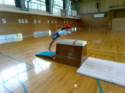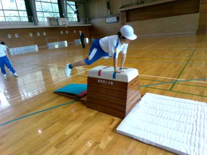 台上前転や開脚跳びに取り組んでいます。手の位置や着地の姿勢に気をつけて練習しています。