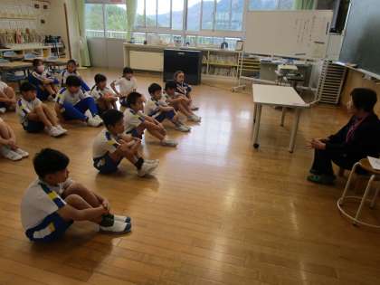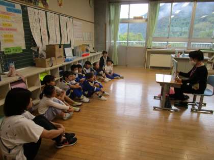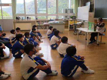 低学年は紙芝居「さるとかめ」(岩稲に伝わる民話)、中学年は「琴三味線」(富山の民話の語り)、高学年は紙芝居「まぼろしの滝」(片掛に伝わる民話)でした。