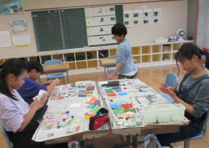 水彩絵の具を小さな紙の上に少しずつ出して、指で混ぜてみたら、意外な美しさが生まれました。4年生は、ひとつとして同じ混ざり方のない色を楽しんでいます。