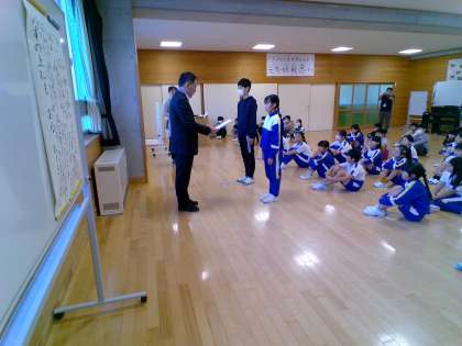 今日の朝の集いでは、学習発表会で歌う「もみじ」の練習をしました。また、社会を明るくする運動、作文コンテストの授賞伝達を行いました。