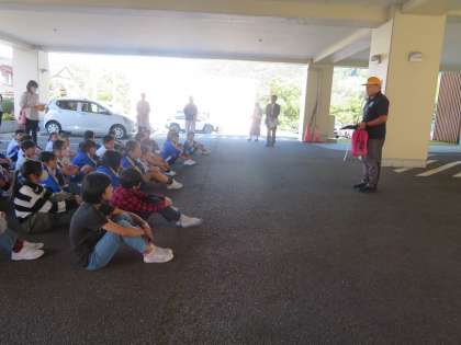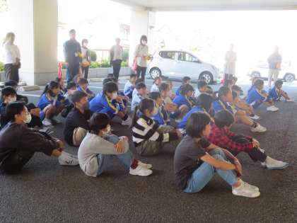 出火場所や避難経路、避難場所を放送でしっかりと聞いて、図書館前のピロティーに避難しました。近くにいた上級生が声をかけ、下級生と一緒に避難する大切な時間となりました。