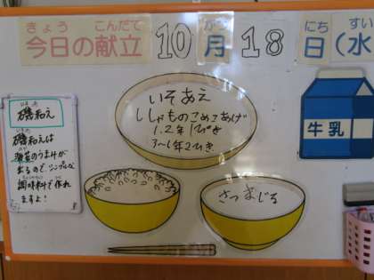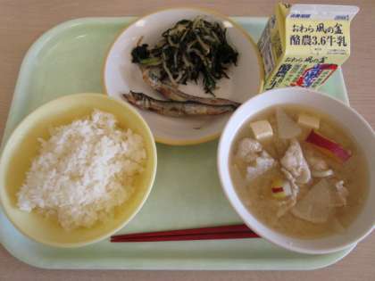 今日の献立は、ごはん、牛乳、ししゃもの米粉揚げ、磯和え、さつま汁です。