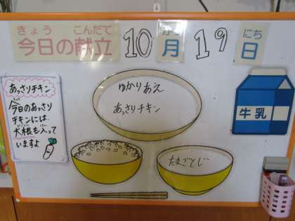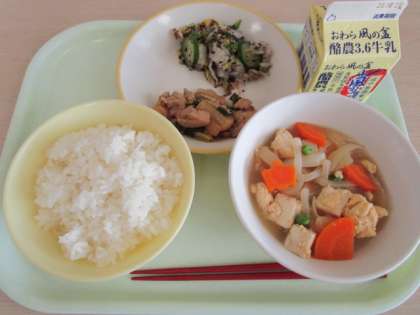 今日の献立は、ごはん、牛乳、あっさりチキン、ゆかり和え、卵とじです。