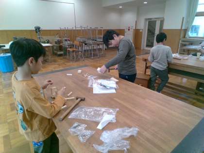 10月20日(金) 3年生 図画工作「くぎうちトントン」 公開日 2023/10/20 更新日 2023/10/20 3年生の部屋 図画工作では、木材に釘を打ち込んでいきながら、思い描いた形にしていきます。慣れない釘打ちに苦労している様子でした。