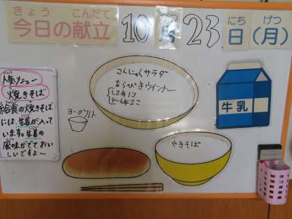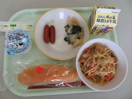今日の献立は、コッペパン、牛乳、あらびきウインナー、こんにゃくサラダ、焼きそば、ヨーグルトです。