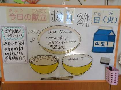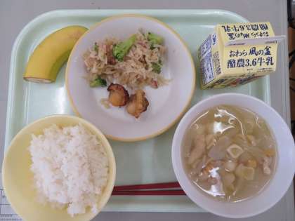 10月24日(火) 今日の給食 公開日 2023/10/24 更新日 2023/10/24 職員室より 今日の献立は、ごはん、牛乳、ほたてのバターしょうゆやき、切り干し大根のペペロンチーノ、マカロニスープ、バナナです。
