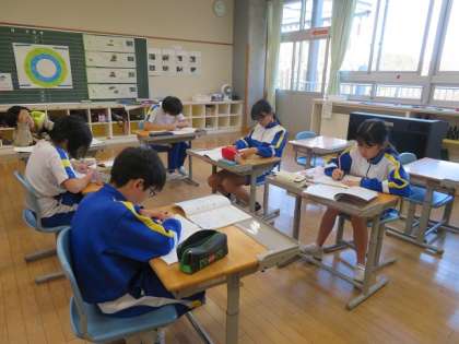 今日の算数では、通分の仕方を確認し、問題を解くことで問題に慣れて正しく解くことをがんばっていた5年生。5年生の算数では、新しい算数の用語と理解する内容が多く、反復練習をしながら、子供たちは真剣に学んでいます。