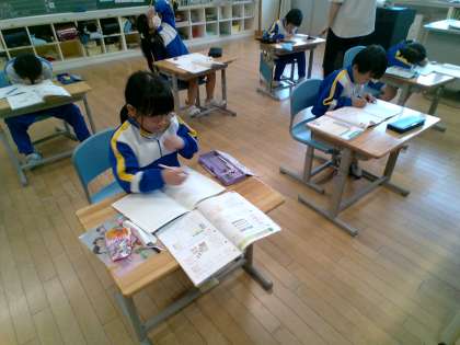 かけ算の練習問題に取り組んでいます。1つ分の数やいくつ分を考えながら解いていました。