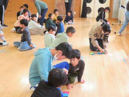 6年生は、国語の学習で行った「みんなが楽しく過ごすために」の発展学習として考えた、全校ゲーム集会を企画しました。