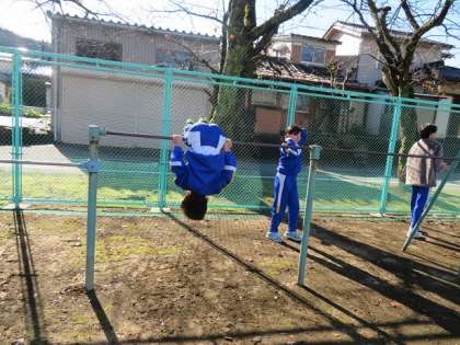 低学年はボール投げ、中学年は走り幅跳び、高学年は鉄棒に取り組みました。