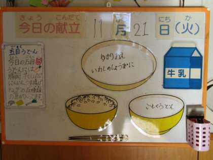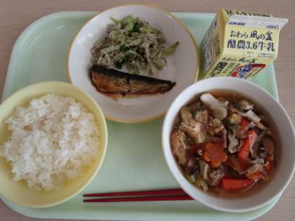 今日の献立は、ごはん、牛乳、いわしの生姜煮、ゆかり和え、五目うどんです。