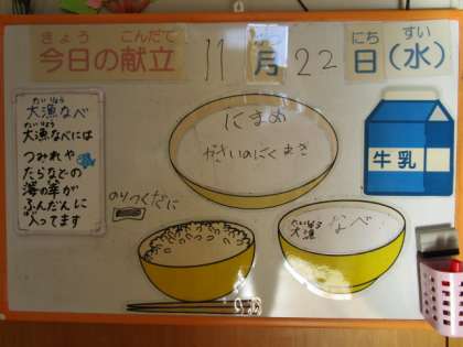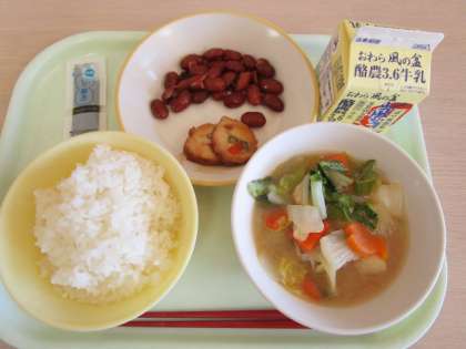 今日の献立は、ごはん、牛乳、野菜の肉巻き、煮豆、大漁なべ、のり佃煮です。