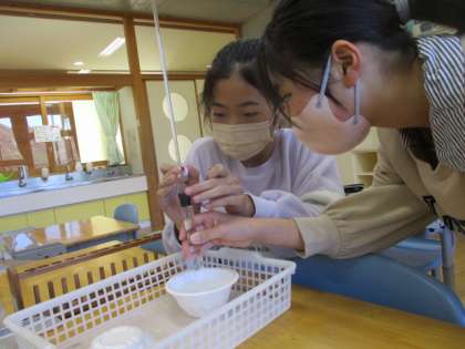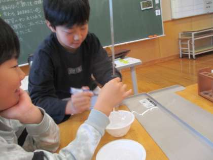 「空気」をあたためたり冷やしたりすると、その体積が変化することを前回の学習で目で見て確かめた4年生。今日は「水」の温度変化で体積が変わるかどうかを確かめました。破損に気を付けながら試験管にガラス管付きの試験官をセットしたり、熱湯の扱いに注意を払ったりと、楽しく真剣に実験を進めていました。さて水の体積に変化はあったのでしょうか。