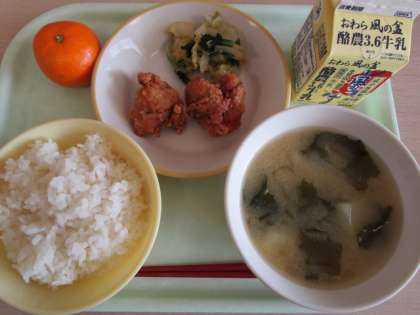 今日の献立は、ごはん、牛乳、鶏のからあげ、小松菜ひたし、じゃがいものみそ汁、みかんです。