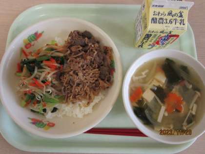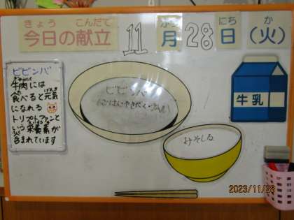 今日の献立は、ごはん、牛乳、ビビンバ(焼き肉・ナムル)、みそ汁です。