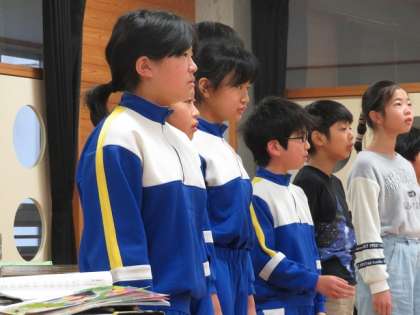 6年生の卒業に向けて主力となっていく5年生。「おめでとう」の気持ちを大切にしたから、1 明るい声 2 口を大きく 3 声を大きく 4 のびる音で歌いたいと考え、歌でも主力となるよう気持ちを高めようとしています。