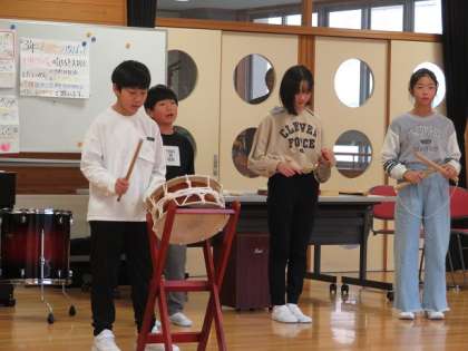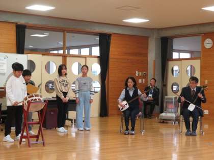 4年生は、「きょうどのまつり」についてしらべよう というテーマで、今回は、富山県の2つの民謡「こきりこ」と「おわら」の演奏と歌唱を披露しました。今日は、八尾町在住の三味線と胡弓の奏者をお迎えし、臨場感溢れる曲を味わいました。