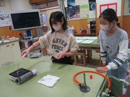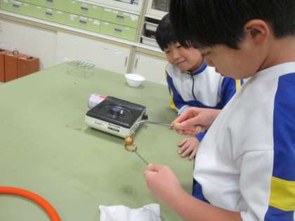 今までの実験から、空気も水も温度によって体積が変わることを知った知った4年生。今日は、空気や水ほど大きな変化ではなかったけれど、金属の体積の変化を確認することができました。実験用コンロなどを安全に気を付けて使ったり、友達と協力して活動を進めたりする姿に成長を感じました。