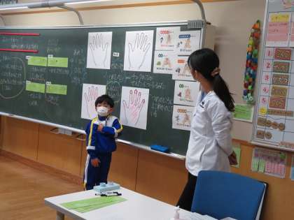 特別活動「めざせ!てあらいめいじん」の学習を、担任と養護教諭と一緒に実施しました。