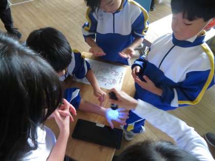 日頃、手洗いはしているものの、本当に汚れが落ちているのかなかなか分かません。子供たちの意識を高めるために、操作活動を取り入れながら学習を進めました。また、手洗いの歌を使って、自分の手の汚れに合わせた手洗いポーズを取り入れながら、主体的に取り組むようにしました。