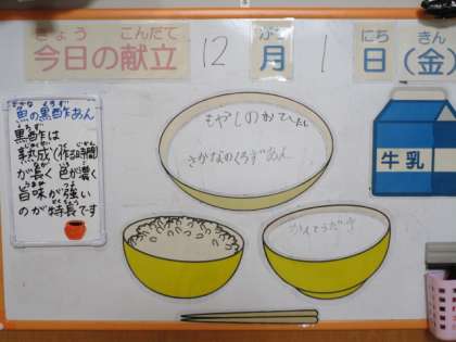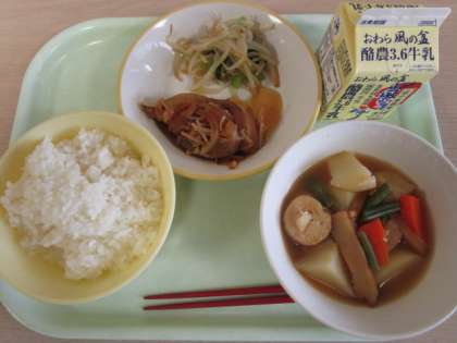 今日の献立は、ごはん、牛乳、魚の黒酢あん、もやしのおひたし、関東だきです。