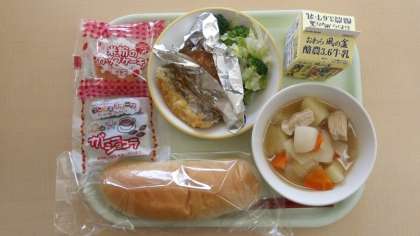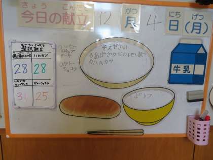 今日の献立は、コッペパン、牛乳、添え野菜、ポトフ、揚げ魚のレモン味またはハムカツ、いちごのカップケーキまたはガトーショコラです。
