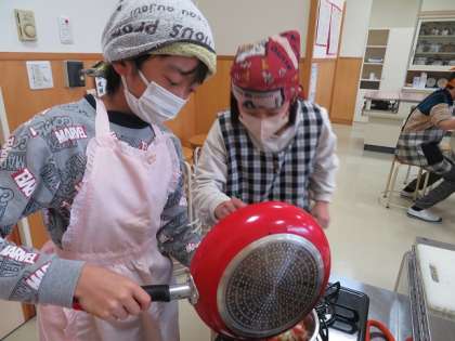 このグループは、彩り豊かな野菜を使ってオムレツをつくる予定でした。思いの他具材が多く、オムレツではなく卵チャンプルに変更しました。臨機応変に軌道修正をしていった二人です。