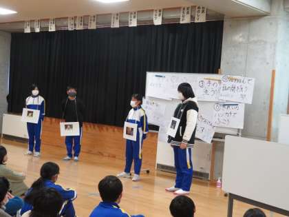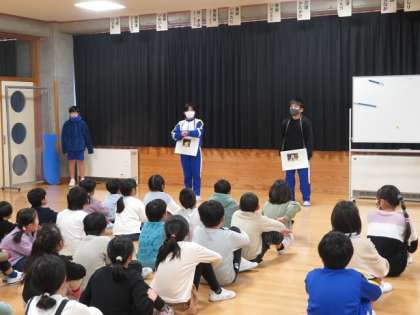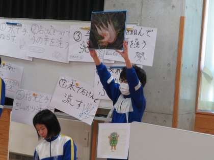委員会の子供たちが役になり切って、手洗いの意義や富山県産食材の理解が深まるように劇にして発表しました。