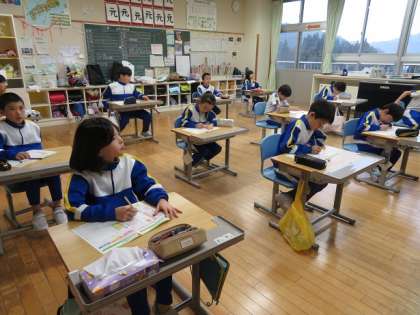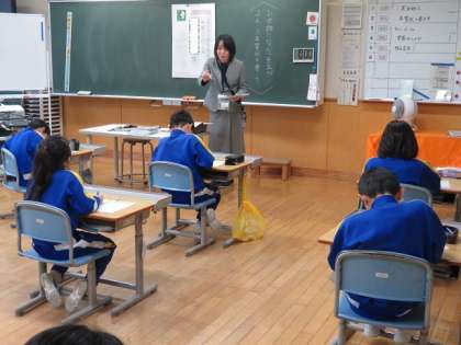 子供たちは、出す相手の宛名や住所、差出人の名前や住所等の書き方を知り、お世話になった先生が喜ぶ年賀状にしようと真剣に学んでいました。