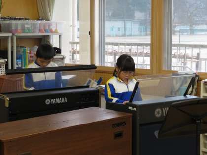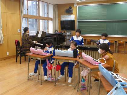 音楽鑑賞では、どんな動物が何をしているのかを曲を聴きながら想像しました。「ぼくは、馬が走っているところだと思う。」「わたしは、鳥が飛んでる曲かなと思う。鳥の名前はハトかな?」と身体を動かしながら、イメージを膨らませる子がいました。また、曲をじっくりと聴いて、頭の中で思い描く子もいます。自由な発想を楽しく語れる子供たちが曲の世界に浸っていた時間でした。