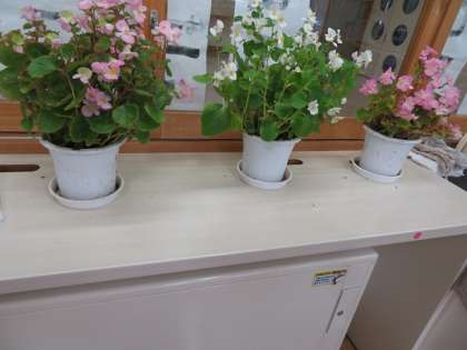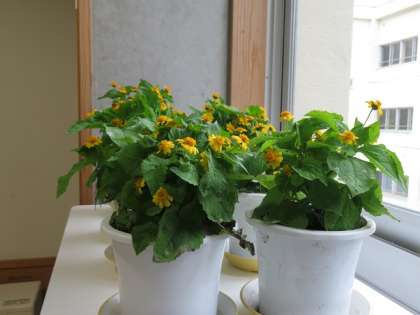 実生で育ったメランポジュウムと花壇から植え替えたベコニアです。花を見ていると心が癒やされますね。