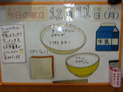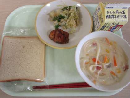 今日の献立は、食パン(減量)、牛乳、照り焼きチキン、切干大根のサラダ、クリームスパゲッティです。