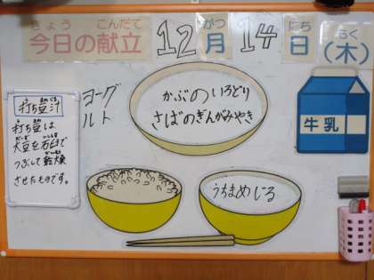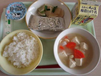 今日の献立は、ごはん、牛乳、さばの銀紙焼き、かぶの色どり、打ち豆汁、ヨーグルトです。