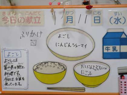 今日の献立は、ごはん、牛乳、にんじんシューマイ、よごし、大根と豚肉の煮込み、ふりかけです。