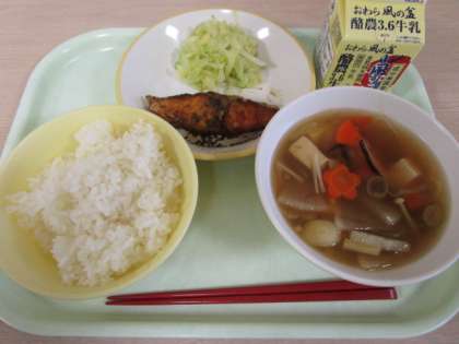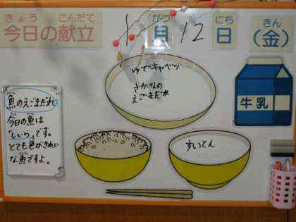 今日の献立は、ごはん、牛乳、魚のえごまだれ、ゆでキャベツ、すいとんです。