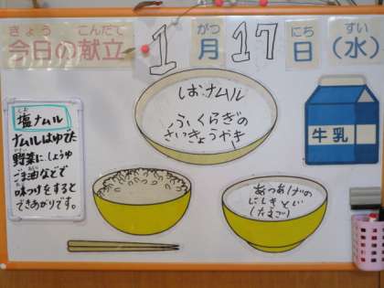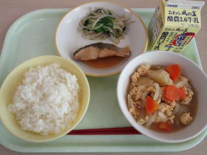 今日の献立は、ごはん、牛乳、ふくらぎの西京焼き、塩ナムル、厚揚げの錦とじです。