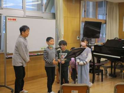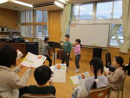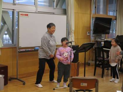 さらに、マイクで「春がきた」を歌うのに合わせて、他の子供たちは「春のまきば」をパートナーソングで歌って楽しみました。